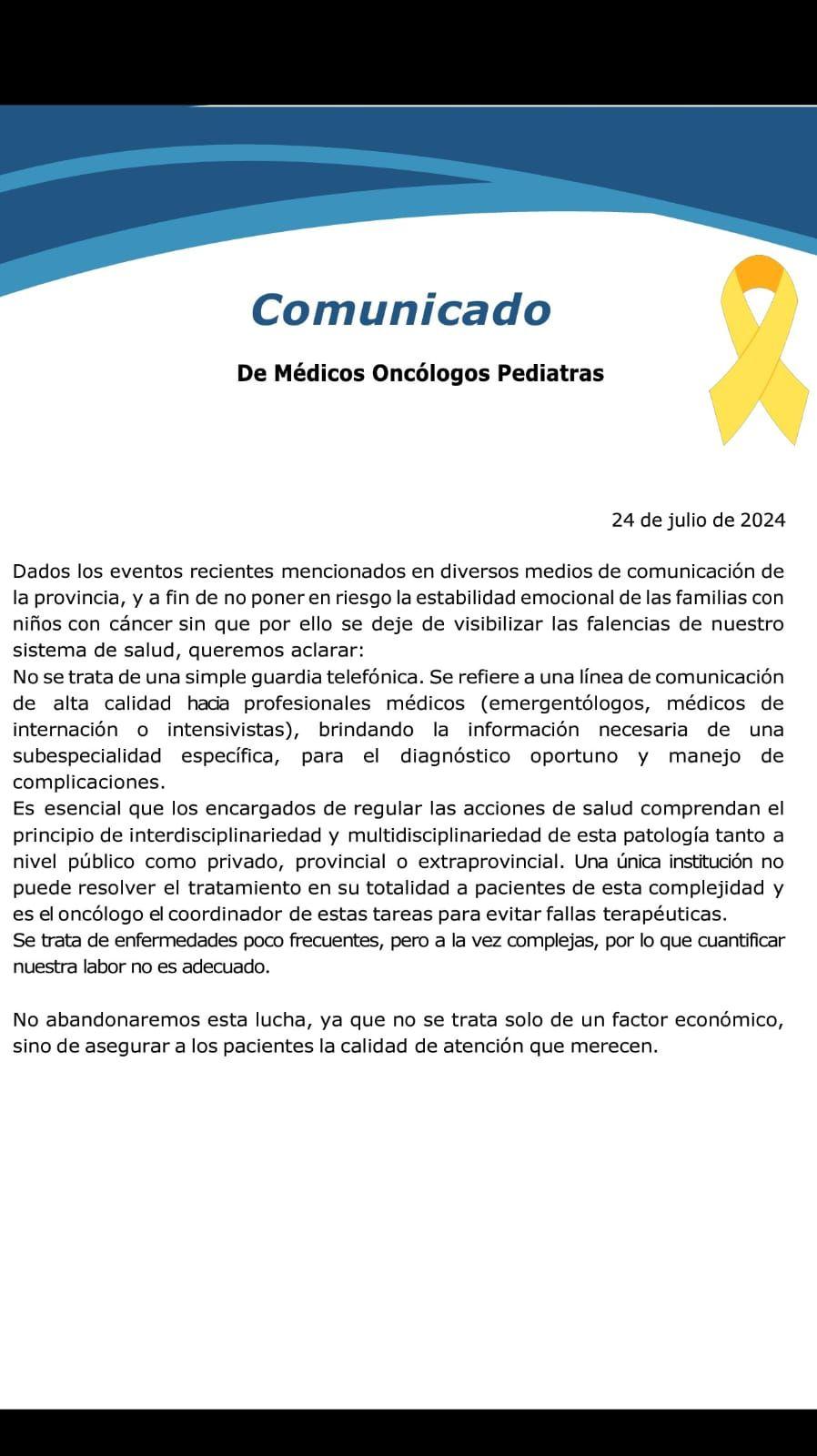 Dados los eventos recientes mencionados en diversos medios de comunicación de la provincia, y a fin de no poner en riesgo la estabilidad emocional de las familias con niños con cáncer sin que por ello se deje de visibilizar las falencias de nuestro sistema de salud, queremos aclarar: